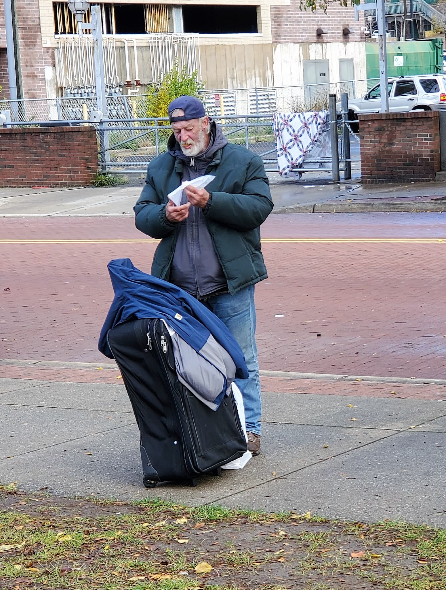 This church has cleared the mini-homeless settlement from its steps. This gentleman was just fixing his backpack and was happy for the food and toiletries.